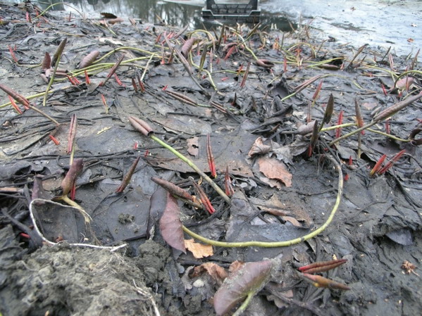 Most water lilies are planted too deep. In the deepest spots of the pond mud accumulates, over-fertilising the water lilies with nitrogen so they form large leaves but few flowers.