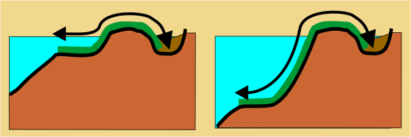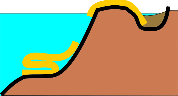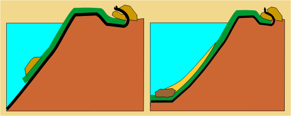 If the next terrace lies deeper then 60cm only the upper bank is usually secured. Then the shore mat ends somewhere on the underwater slope. It the shore mat isn't weighed down properly, it will swim upward.