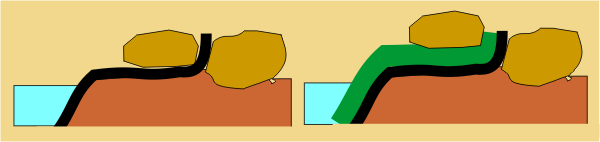 The shore mat mustn't go beyond the shell because of the capillary effect (top). It is usually better to build a swamp area (bottom). The liner (yellow) and the shore mat are laid over the shell's edge into a separate basin. |