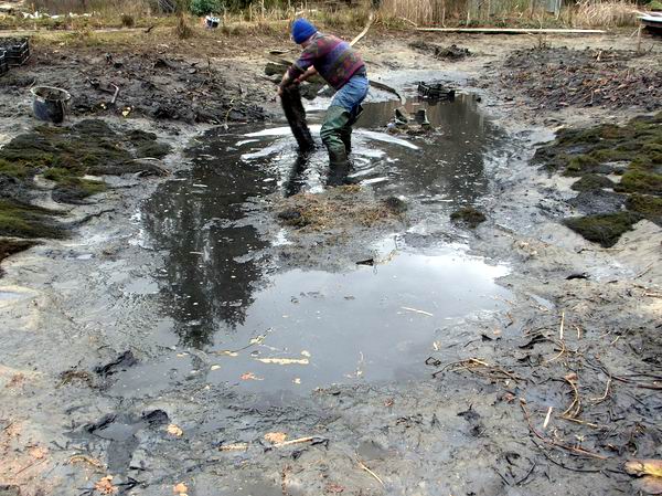 To replace a broken liner means a complete new start: mud out, plants out, decoration out. This mud fight can go on for days and is also a problem for anything that lives in the pond. |