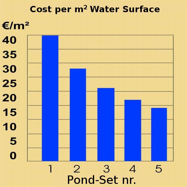 Once the required depth is reached, every square metre on the ground also means (nearly) another square metre surface of water. The larger the pond gets, the less expensive each additional square metre. The chart to the right shows it clearly: Pond #1 costs 40.00 Euros per square metre, Pond #5 just 15.00 Euros. |