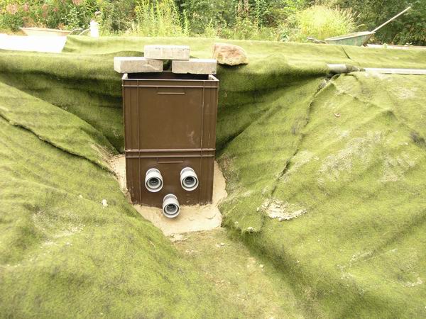 The well can also be connected to the NaturaGart filtering trench with a large pipe. If water is pumped out of the trench, the water level sinks in the well, and water flows in through the openings.