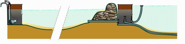 AA pump is installed at the end of the filtering trench in a separate well. Trench and well have the same level of water. When the pump is working, the water level in the well falls and water flow in through he pipes. |