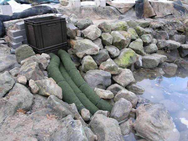 Well installation for a rennovation. The pipes are camouflaged and well and pipes are later covered with stones.